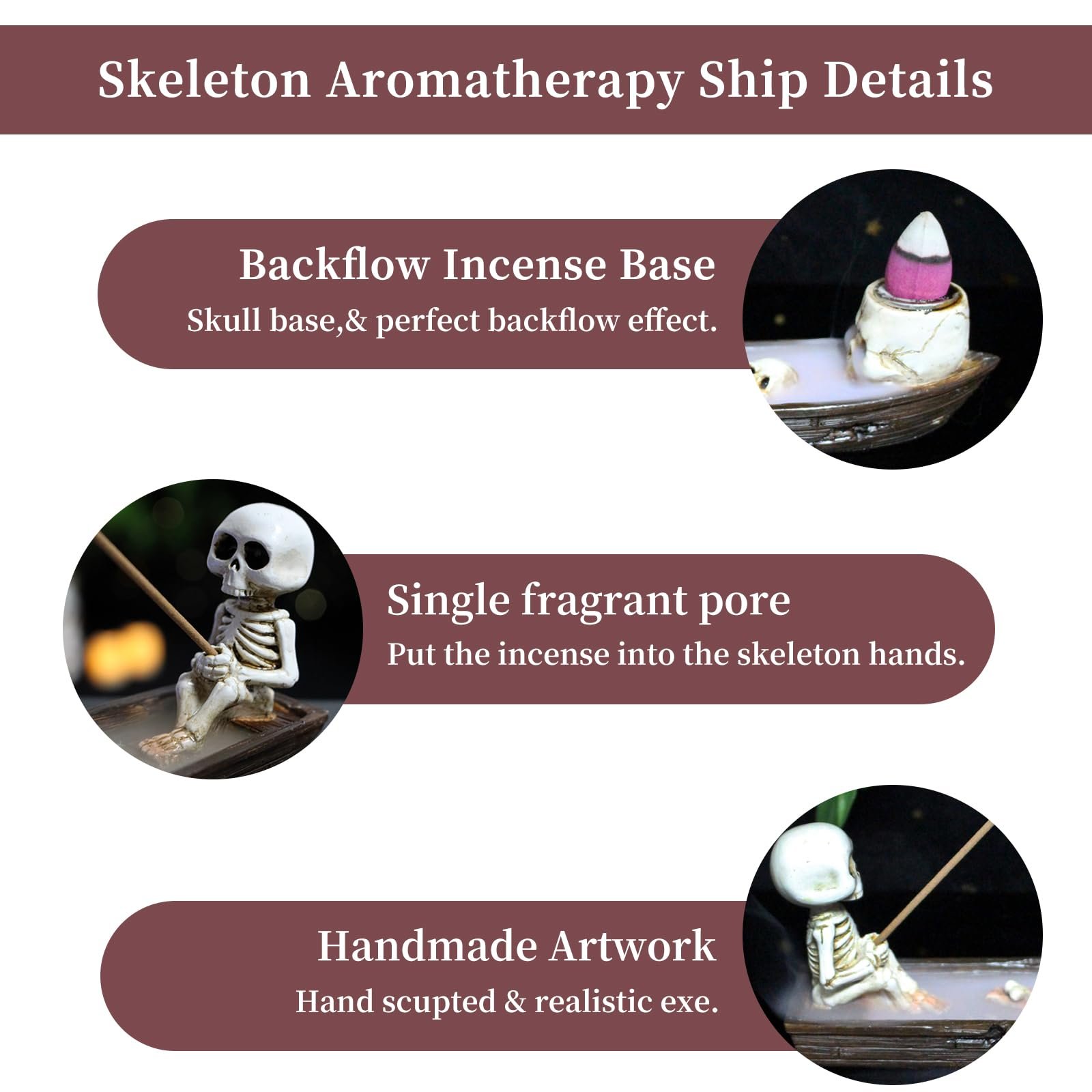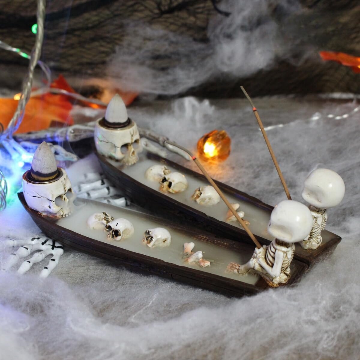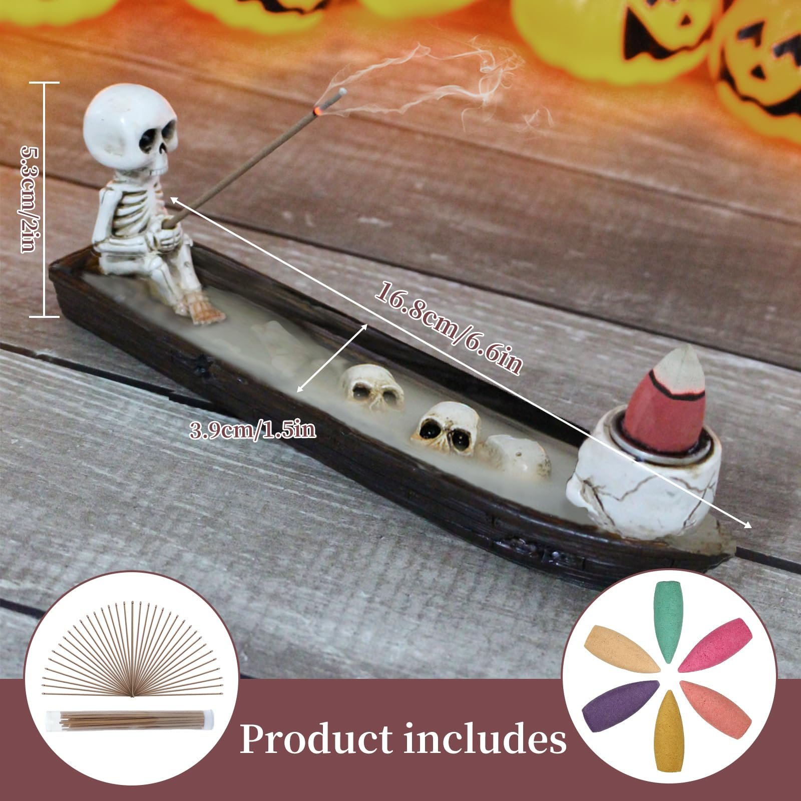 Dual Purpose Burner: Use as an incense stick holder (place in the skeleton’s hand) or a waterfall cone burner (set on the ship’s bow), or combine both for a mesmerizing ferry boat engulfed in swirling smoke.